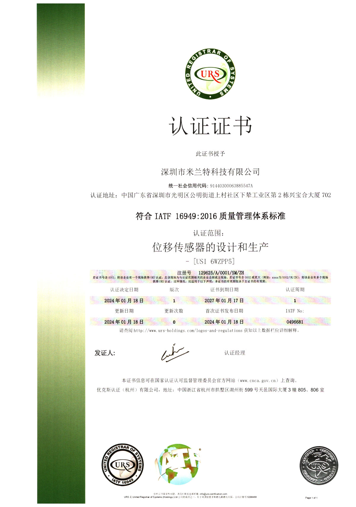 米蘭特ISO質(zhì)量管理體系認(rèn)證證書